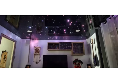 Además de su impresionante efecto visual, nuestros techos estrellados incorporan tecnología LED RGBW de última generación para aportar color y dinamismo a tu cielo artificial. Esto permite controlar fácilmente los colores e intensidad de las estrellas mediante un mando a distancia o una app móvil, adaptando la atmósfera a cada momento. Si utilizamos un techo tensado lacado oscuro como base, el efecto se potencia aún más: el acabado espejo refleja sutilmente los puntos de luz, multiplicando la sensación de profundidad y creando una atmósfera verdaderamente mágica.